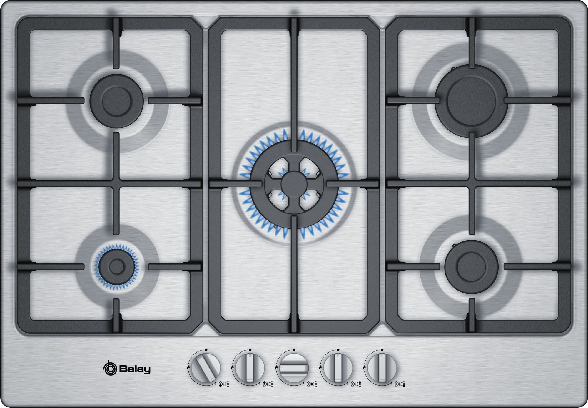 5 GAS. BUTANO. 75 CM. ACERO INOX. WOK DE DOBLE LLAMA. PARRILLAS CONTINUAS DE HIERRO FUNDIDO. AUTOENCENDIDO. GAS STOP. ENCASTRE ESTANDAR DE 56*49 CM. INYECTORES PARA GAS NATURAL INCLUIDOS.