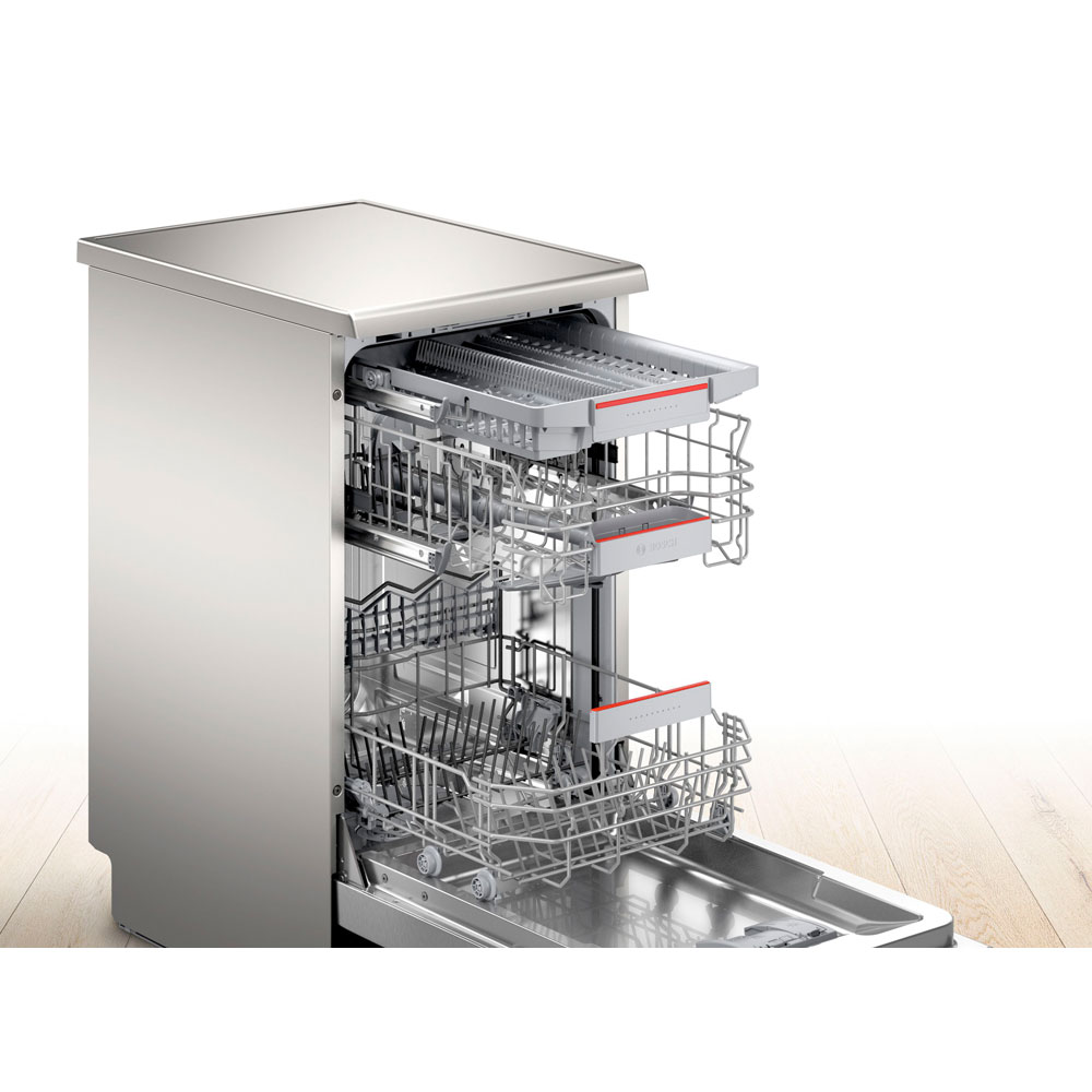 BOSCH, SPS4HMI53E, Lavavajillas, E, Libre instalación, 45 cm., 10 servicios, HC, Acero inoxidable, Nuevo dieño display+teclas, 3ª bandeja, Pgr.. Auto 1h, Favorito. Prog. esp. limpieza cuba2.0. 3 f: Extra seco, VSPlus. 9,5litros, 45db.