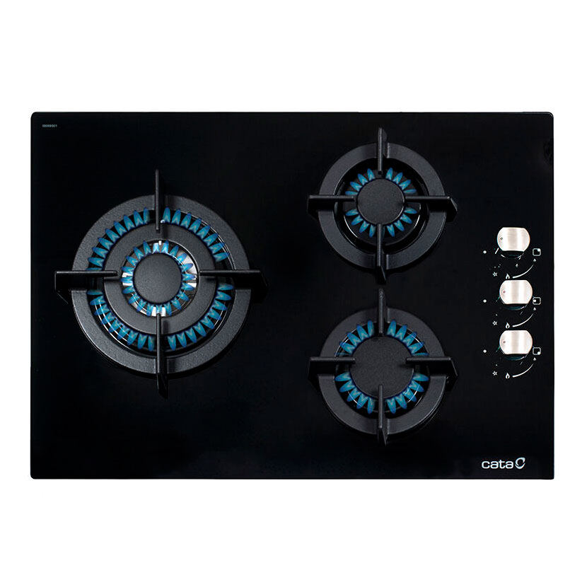 3 GAS (1 QUEMADOR TRIPLE CORONA). NATURAL. CRISTAL GAS. ENCENDIDO ELECTRONICO INTEGRADO EN MANDO. PARRILLAS/QUEMADORES DE HIERRO FUNDIDO. ENTRADA GAS PARTE TRASERA IZQUIERDA. INYECTORES BUTANO INCLUIDOS EN LA CAJA.